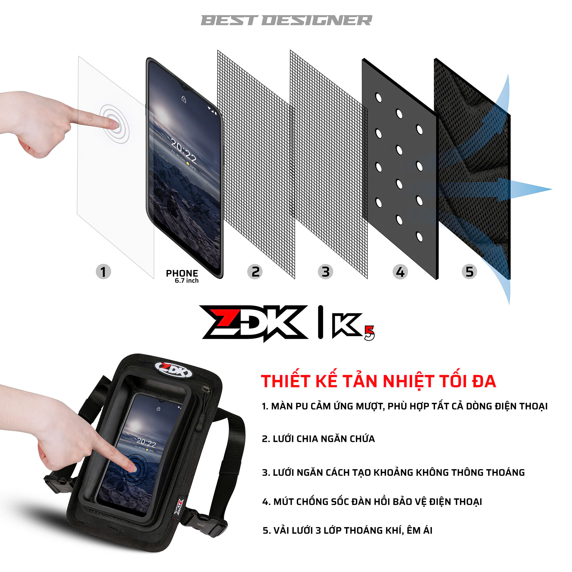 Túi ZDK K5 được thiết kế với màn hình cảm ứng PU siêu mềm mượt, tương thích với tất cả các dòng điện thoại trên thị trường. Bạn sẽ không phải lo lắng về việc thao tác trên màn hình bị gián đoạn hay khó khăn, ngay cả khi đang di chuyển trên đường.