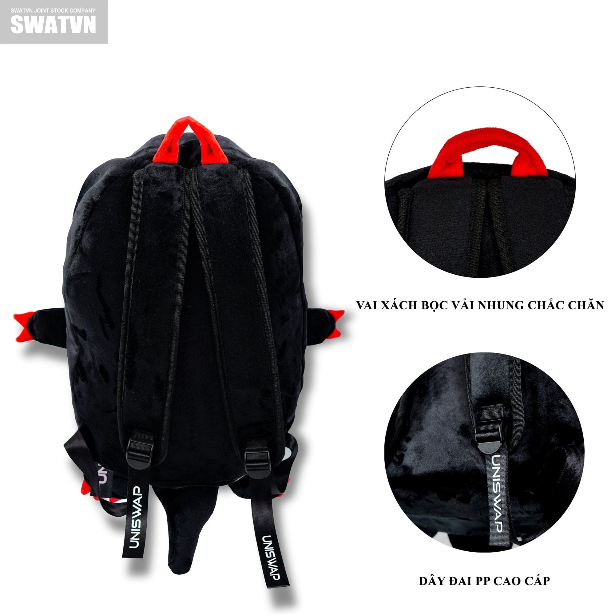 - Vai đeo balo được làm bằng vải nhung siêu êm, mang lại cảm giác dễ chịu khi đeo, dây đai điều chỉnh được làm bằng vải polypropylen cứng cáp, chắc chắc, nổi bật ở dòng chữ UNISWAP sang trọng, bắt mắt
